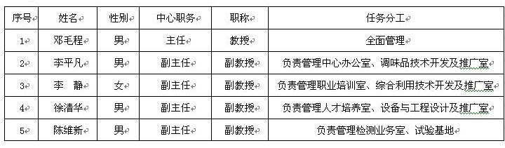 中心主任由学校提名,广东省教育厅聘任。中心主任在管理委员会领导下,依据技术指导委员会制定的研究方向和发展目标,主持工程技术开发中心全面工作,并向学校提名推荐工程技术开发中心副主任和技术指导委员会成员人选,由学校聘任。