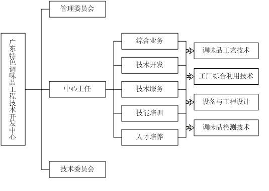 广东特色调味品工程技术开发中心的组织体制分二层架构:上层设管理委员会;下层为中心主任负责下的业务机构。如图所示: